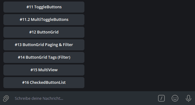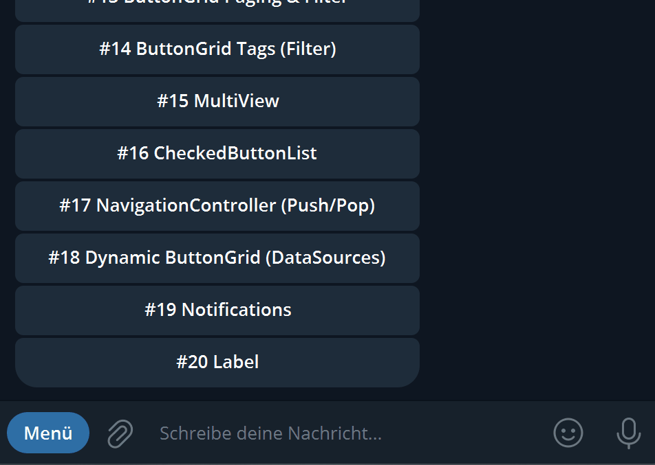 # .NET Telegram Bot Framework - Context based addon [![NuGet version (TelegramBotBase)](https://img.shields.io/nuget/v/TelegramBotBase.svg?style=flat-square)](https://www.nuget.org/packages/TelegramBotBase/) [![Telegram chat](https://img.shields.io/badge/Support_Chat-Telegram-blue.svg?style=flat-square)](https://www.t.me/tgbotbase) [![License](https://img.shields.io/github/license/MajMcCloud/telegrambotframework.svg?style=flat-square&maxAge=2592000&label=License)](https://raw.githubusercontent.com/MajMcCloud/TelegramBotFramework/master/LICENCE.md) [![Package Downloads](https://img.shields.io/nuget/dt/TelegramBotBase.svg?style=flat-square&label=Package%20Downloads)](https://www.nuget.org/packages/TelegramBotBase) **Showcase: [@TGBaseBot](https://t.me/TGBaseBot)** **Support group: [@tgbotbase](https://t.me/tgbotbase)** **Discord Server: [https://discord.gg/p3PPhYbTf](https://discord.gg/p3PPhYbTf)** **Releases: [GitHub](https://github.com/MajMcCloud/TelegramBotFramework/releases)** ## Donate Paypal: [https://paypal.me/majmccloud](https://paypal.me/majmccloud) Bitcoin: `1GoUJYMwAvBipQTfw2FKydAz12J8RDyeJs` / `bc1qqwlp0p5ley29lsu6jhe0qv7s7963kfc7d0m53d` Etherium: `0xAf3835104c2C3E5b3e721FA2c7365955e87DB931` Litecoin: `LRhF1eB7kneFontcDRDU8YjJhEm2GoYHch` Dashcoin: `XudiUwWtSmAJj1QDdVW7jocQumJFLsyoGZ` Tron: `TYVZSykaVT1nKZnz9hjDgBRNB9VavU1bpW` BitTorrent: `TYVZSykaVT1nKZnz9hjDgBRNB9VavU1bpW` --- ## Index - [Quick start](#quick-start) - [Simplified builder](#simplified-builder) - [Features](#features) * [System calls & bot commands](#system-calls--bot-commands) * [Text messages handling](#text-messages) * [Buttons](#buttons) * [Custom controls](#custom-controls) * [Forms advanced](#forms-advanced) - [Special Forms](#forms) * [AlertDialog](#alert-dialog) * [AutoCleanForm](#autocleanform) * [PromptDialog](#prompt-dialog) * [ConfirmDialog](#confirm-dialog) - [Controls](#controls) * [Label](#label) * [ProgressBar](#progress-bar) * [CalendarPicker](#calendar-picker) * [MonthPicker](#month-picker) * [TreeView](#tree-view) * [ToggleButton](#toggle-button) * [ButtonGrid](#button-grid) * [Paging and Searching](#paging--searching) * [TaggedButtonGrid](#tagged-button-grid) * [CheckedButtonList](#checked-button-list) * [MultiToggleButton](#multi-toggle-button) - [Groups](#groups) * [SplitterForm](#splitter-form) * [GroupForm](#group-form) - [State Machine and Session Serialization (v3.0.0)](#statemachine-and-sessions) * [StateMachines](#statemachines) * [SimpleJSONStateMachine](#simplejsonstatemachine) * [JSONStateMachine](#jsonstatemachine) * [XMLStateMachine](#xmlstatemachine) * [Interfaces](#interfaces) * [IStateMachine](#istatemachine) * [IStateForm](#istateform) * [Attributes](#attributes) * [SaveState](#savestate) * [IgnoreState](#ignorestate) - [Navigation and NavigationController (v4.0.0)](#navigation-and-navigationcontroller) * [As of Now](#as-of-now) * [Usage](#usage) - [Extensions](#extensions) - [Test Project](#test-project) - [Examples](#examples) --- ## Quick start First of all, create a new empty dotnet console project and paste some code: ```csharp // public async Task Main(string[] args) var bot = BotBaseBuilder .Create() .WithAPIKey("{YOUR API KEY}") // do not store your API key as plain text in project sources .DefaultMessageLoop() .WithStartForm() .NoProxy() .CustomCommands(a => { a.Start("Starts the bot"); }) .NoSerialization() .UseEnglish() .Build(); // Upload bot commands to BotFather await bot.UploadBotCommands(); // Start your Bot await bot.Start(); ``` The `BotBase` class will manage a lot of things for you, like bot commands, action events and so on. `StartForm` is your first form which every user will get internally redirected to, *just like a start page*. It needs to be a subclass of `FormBase` you will find in namespace `TelegramBotBase.Base` Every `Form` has some events which will get raised at specific times. In every form, you are able to get notes about the *Remote Device*, like ChatId and other stuff your carrying. From there you build up your bots: ```csharp public class StartForm : FormBase { // Gets invoked during Navigation to this form public override async Task PreLoad(MessageResult message) { } // Gets invoked on every Message/Action/Data in this context public override async Task Load(MessageResult message) { // `Device` is a wrapper for current chat - you can easily respond to the user await this.Device.Send("Hello world!"); } // Gets invoked on edited messages public override async Task Edited(MessageResult message) { } // Gets invoked on Button clicks public override async Task Action(MessageResult message) { } // Gets invoked on Data uploades by the user (of type Photo, Audio, Video, Contact, Location, Document) public override async Task SentData(DataResult data) { } //Gets invoked on every Message/Action/Data to render Design or Response public override async Task Render(MessageResult message) { } } ``` Send a message after loading a specific form: ```csharp await this.Device.Send("Hello world!"); ``` Want to go to a different form? Go ahead, create it, initialize it and navigate to it: ```csharp var form = new TestForm(); await this.NavigateTo(form); ``` ## Simplified builder When migrating from a previous version or starting completely new, all these options can be a bit overwhelming. There's a function called `QuickStart` that simplifies building a bit. ```csharp var bot = BotBaseBuilder .Create() .QuickStart("{YOUR API KEY}") .Build(); await bot.Start(); ``` ## Features ### System calls & bot commands Using BotFather you can add *Commands* to your bot. The user will see them as popups in a dialog. Before starting (and later, for sure), you could add them to your BotBase. If the message contains a command, a special *event handler* will get raised. Below we have 4 commands. `/start` - opens the start form `/form1` - navigates in this context to form1 `/form2` - navigates in this context to form2 `/params` - demonstrates the use of parameters per command (i.